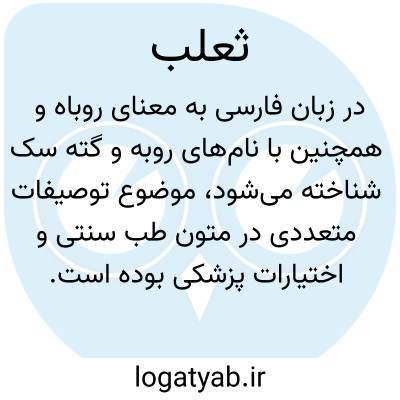 در زبان فارسی به معنای روباه و همچنین با نام‌های روبه و گته سک شناخته می‌شود، موضوع توصیفات متعددی در متون طب سنتی و اختیارات پزشکی بوده است. در کتاب اختیارات بدیعی به خواص درمانی متعددی از این حیوان اشاره شده است؛ به عنوان مثال، بیان گردیده که اگر گوشت ثعلب را با آب بپزند و عصاره آن را بر مفاصل بمالند، تأثیر شگرفی در بهبود درد مفاصل دارد. به ویژه، اگر حیوان زنده پخته شده و فرد مدتی در آن آب بنشیند، این اثر تقویت می‌شود، البته این عمل باید پس از پاکسازی‌های لازم انجام گیرد. همچنین، پیه آن برای تسکین دردهای گوش سودمند دانسته شده و استفاده از آن به عنوان قطره گوش، بینایی را تقویت کرده و کری و درد گوش را از بین می‌برد.