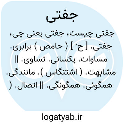 جفتی. [ ج ُ ] ( حامص ) برابری. مساوات. یکسانی. تساوی. || مشابهت. ( اشتنگاس ). مانندگی. همگونی. همگونگی. || اتصال. ( اشتنگاس ). پیوستگی. || همسری. شوهری. زنی. زوجیت. جفت بودن:
