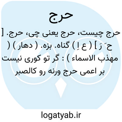 (حَ رَ ) [ ع. ] (اِ. ) ۱ - تنگی، فشار. ۲ - جای تنگ. ۳ - گناه، بزه.