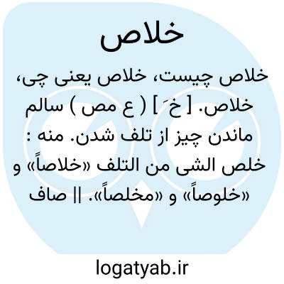 خلاص. [ خ َ ] ( ع مص ) سالم ماندن چیز از تلف شدن. منه: خلص الشی من التلف «خلاصاً» و «خلوصاً» و «مخلصاً». || صاف شدن آن. منه: خلص الماء من الکدر. ( منتهی الارب ) ( از تاج العروس ) ( از لسان العرب ) ( از اقرب الموارد ).