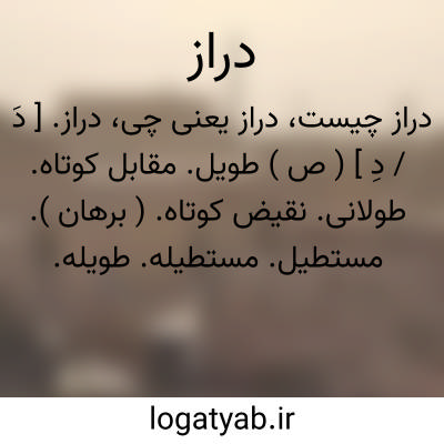 دراز. [ دَ / دِ ] ( ص ) طویل. مقابل کوتاه. طولانی. نقیض کوتاه. ( برهان ). مستطیل. مستطیله. طویله. مقابل قصیر. طویل و آن یا طولی است عمودی، چنانکه از بالائی بدان بینند، چون: گیسوانی،دستی، ریشی دراز یا مقابل پست و آن طولی باشد عمودی، چون از زیر بدان نگرند؛ قامتی، کوهی دراز؛ بلند و طویل القامه. ( از یادداشت مرحوم دهخدا ). یا طولی است افقی مقابل عریض و پهن، چنانکه دیواری و راهی و غیره. مرادف ممتد و کشیده و مدید. أخدب. أذب. ( منتهی الارب ). أشجع. ( منتهی الارب ) ( دهار ). أشق. ( تاج المصادر بیهقی ). أشوس. اطریح. أعط. اغین. امق. ( منتهی الارب ) ( تاج المصادر بیهقی ). تلیع. جرواط. جسرب. جعشوش. جلادح. جلجب. جلعاب. خبق. خدب. خرانف. خنب. خندیذ. ذنب. سابغ. سباطر. سبط. سبیطر. سرطل. سریاح. سقب. سلب. سلحم. سلهب. سلهج. سلهم. سمروت. سمرود. سندری. سوحق. شبحان. شجب. شجوجاء. شجوجی. شحسار. شحشاح. شحشحان. شرجب. شرداح. شرعب. شرعبی. شرمح. شرواط. شعشاع. شعشع. شعلع. شعنلع. شغموم. شمخاط. شمخط. شمخوط. شمطوط. شمق. شمقمق. شمقة. شناق. شنخب. شنعم. شنغاب. شیحان. صعل. صقعب. صلهب. صیهد. طرحوم. طرعب. طوال. طویل. طویلة. عرطل. عرطلیل. عشنط. علود. عماهج. عمرد. عمرط. عمرود. عمهج. عمهوج. عنطنط. عیطل. قد. قسیب. قنور.قهنب. قهنبان. قهوس. قیدود. مخبونة. مخن. مسبغل. مسعر. مسموک. مصلهب. معن. میلع. هجنع. هدید. هرجاب. هرجب. هقور. هلقام. هیجبوس. ( منتهی الارب ):