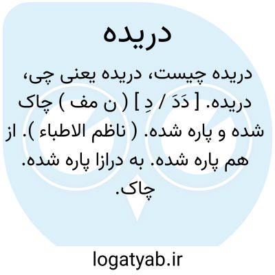 دریده. [ دَدَ / دِ ] ( ن مف ) چاک شده و پاره شده. ( ناظم الاطباء ). از هم پاره شده. به درازا پاره شده. چاک. شکافته. کفته.مخروق. منفلق. واهیة. ( از منتهی الارب ):
