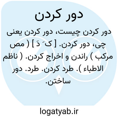 دور کردن. [ ک َ دَ ] ( مص مرکب ) راندن و اخراج کردن. ( ناظم الاطباء ). طرد کردن. طرد. دور ساختن. بفاصله گرفتن واداشتن. ابعاد. ( یادداشت مؤلف ). اجناب. ادحاق. ( تاج المصادر بیهقی ). ازدیال. تزویل. ازالة. ( منتهی الارب ). ازالة. ( دهار ). ازاحة. ( دهار ) ( تاج المصادر بیهقی ). ازاخة. زیل. ازال. اشقاذ. اشقاح.( منتهی الارب ). اسحاق. ( تاج المصادر بیهقی ) ( دهار ). اعزاب. ( منتهی الارب ). اشحاط. ( منتهی الارب ) ( تاج المصادر بیهقی ) ( المصادر زوزنی ). اشساع. ( تاج المصادر بیهقی ). اماتة. ( دهار ). اماطة. ( منتهی الارب ) ( تاج المصادر بیهقی ). اناء. ( المصادر زوزنی ). دفاع. ایام. خسا. دحور. ( دهار ). جنب. تجنیب. ( دهار ) ( تاج المصادر بیهقی ). تدخین. تعزیب. تنحیة. تنزیه. ( تاج المصادر بیهقی ). تشعیث. تطریح. تغمیر. ( منتهی الارب ). دحر. ( تاج المصادر بیهقی ) ( دهار ). زحزحة. ( دهار ) ( المصادر زوزنی ). زفت. زلحفه. تزلحف. شحن. طخ. طرد. غرج. قعط. کرکرة. لتاء. لتز. لک. لکم. لمز. کدش. مشاعبة. ملادة. مناضحة. میط. میطان. نهر. همز. هیاط. ( منتهی الارب ). میط. ( تاج المصادر بیهقی ). دحر. دحور. دحو. جنب. جنوب.مباعدة. تجنیب. ابعاد. ( ترجمان القرآن ). حسر. ذود. درء. نسخ. انتساخ. احصاف. بعاد. دلظ. نضح. ( یادداشت مؤلف ): جنابة؛ دورکردن چیزی از چیزی. دراء؛ دور کردن و دفع نمودن چیزی را. جلو؛ دور کردن غم کسی را. اجفاء؛ دور کردن کسی را. مدافعه. دفاع؛ دور کردن از کسی. خسع؛ دور کردن از کسی. ( منتهی الارب ):
