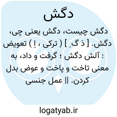 دگش. [ دَ گ ِ ] ( ترکی، اِ ) تعویض: آلش دگش؛ گرفت و داد، به معنی تاخت و پاخت و عوض بدل کردن. || عمل جنسی و فعل بدی که دو مرد یا جوان نوبلوغ متقابلاً با یکدیگر کنند. ( از فرهنگ لغات عامیانه ).