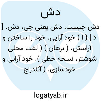 دش. [ دَ ] ( اِ ) خود آرایی. خود را ساختن و آراستن. ( برهان ) ( لغت محلی شوشتر، نسخه خطی ). خود آرایی و خودسازی. ( آنندراج ). خود آراستن. ( غیاث ). || صورت خوش. ( برهان ). صورت خوب. ( لغت محلی شوشتر، نسخه خطی ). || شبه و نظیر و مانند. ( برهان ). شبیه و مانند. ( لغت محلی شوشتر، نسخه خطی ). احتمال اینکه کلمه در این معنی دگرگون شده «وش » باشد نیز هست. دس. و رجوع به دس شود.