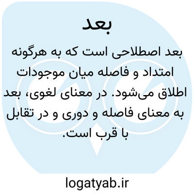 ( اسم ) ۱- دوری: مقابل قرب نزدیکی. ۲- جدایی. ۳- هر یک از امتدادات ثلاثه: طول عرض و عمق یا ارتفاع کشش. ۴- فاصل. نقطه از صفح. قایم تصویر. ۵- زاوی. مسطحه بین دایر. ساعتی یک ستاره و دایر. ساعتی مبدائ. ۶- نزد حکمایی که قایل بوجود خلا هستند بردو نوع است: یکی امتداد قایم بجسم تعلیمی و دیگری امتداد مجرد از ماده که قایم به نفس است بنحوی که اگر جسمی شاغل آن نباشد خلا خواهد بود. ۷- در اصطلاح موسیقی امروز فاصله است و آن فاصله بین هر پرده و خرک باشد. جمع: ابعاد. یا قرب و بعد. نزدیکی و دوری: ( قرب و بعد از صفات اجسام است. )