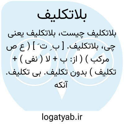 بلاتکلیف. [ ب ِ ت َ ] ( ع ص مرکب ) ( از: ب + لا ( نفی ) + تکلیف ) بدون تکلیف. بی تکلیف. آنکه نداند چه کار باید بکند. ( فرهنگ فارسی معین ). که نداند چه بایدش کردن.