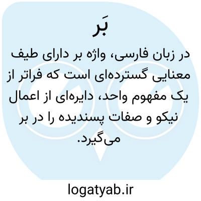 بر. [ ب َ ] ( حروف اضافه، اِ ) بلندی. ( ناظم الاطباء ). بالا. ( انجمن آرا ) ( آنندراج ) ( برهان ). بالای. زبر. روی. سر. ( ناظم الاطباء ). مقابل فرود. مقابل پایین. ( برهان ). مقابل زیر. بر برای استعلاست و بر زبر و بر بالای و بر روی و امثال آن غلط نباشد و قدما بسیار معمول داشته اند. ( یادداشت مؤلف ):