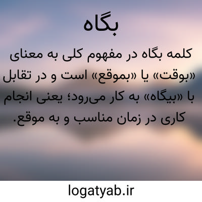 کلمه بگاه در مفهوم کلی به معنای «بوقت» یا «بموقع» است و در تقابل با «بیگاه» به کار می‌رود؛ یعنی انجام کاری در زمان مناسب و به موقع. این معنا تأکید بر رعایت نظم زمانی و اهمیت انجام امور در زمان مقرر دارد.