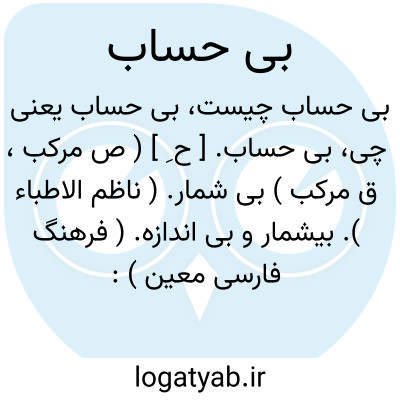 بی حساب. [ ح ِ ] ( ص مرکب، ق مرکب ) بی شمار. ( ناظم الاطباء ). بیشمار و بی اندازه. ( فرهنگ فارسی معین ):