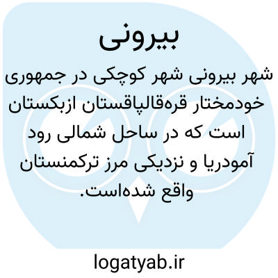 بیرونی (ازبکستان). بیرونی ( ازبکی: Beruniy / Беруний؛ قره قالپاق: Biruniy / Бируний؛ روسی: Беруни )، شهری کوچک در قره قالپاقستان، ازبکستان است. در سواحل شمالی آمودریا و در نزدیکی مرز ازبکستان با ترکمنستان واقع شده است. این شهر مرکز شهرستان بیرونی است.