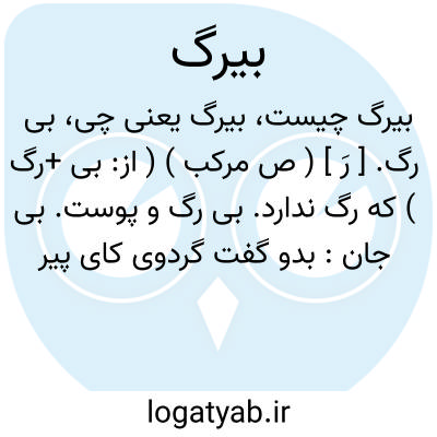 چو دشمن بود بی رگ و پوست به.فردوسی.|| کنایه از بیدل و بی غیرت. ( برهان ) ( ناظم الاطباء ). مرد بی غیرت و بی حمیت و بی عصبیت چه عصب در لفظ عرب بمعنی رگ و پی است که قوت حرکت بدن بدان است. ( انجمن آرا ) ( آنندراج ). و رجوع به رگ شود. || کنایه از کاهل در کار.تنبل. بی پشت کار. ( یادداشت مؤلف ).، بیرگ. ( اِخ ) رشته کوه جنوب شرقی ایران در بلوچستان در شمال شرقی ایرانشهر. امتدادش از شمال غربی تا جنوب شرقی است و ارتفاعش به 2740 متر میرسد. ( دایرة المعارف فارسی ).
