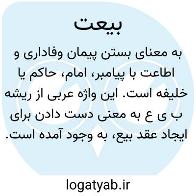 بیعت در لغت تعهد و پیمانی که بیعت کننده با بیعت شونده (امام، حاکم یا امیر) بر اطاعت و فرمان برداری از او و سپردن امور خود به وی می بندد. شیوه ای رایج در فرهنگ اسلامی برای پیمان بستن مردم با حاکمان که بر پایۀ آن به وفاداری گردن می نهند.بیشتر بیعت ها در عصر پیامبر (صلی الله علیه و آله وسلّم) و خلفا از طریق دست دادن با حاکم صورت می گرفته است. البته بیعت حضوری بدون دست دادن و بیعت غیرحضوری با نمایندۀ حاکم، یا با فرستادن نامه نیز شناخته شده بوده است. این شیوه در سده های متمادی از تاریخ اسلام، از جانب عموم مردم برای مشروعیت داشتن حاکم در اعمال حاکمیت، ضروری دانسته می شد. دربارۀ شرایط و لوازم آن نیز از سوی متکلمان سده های نخست، و پس از آن در فقه اسلامی بحث هایی شده است.عرب پیش از اسلام برای پذیرش حاکمیت از فردی و تعهد به فرمان برداری از وی بیعت می کرده است. با آمدن اسلام این شیوه هم چنان رایج ماند و کسانی که مسلمان می شدند، در پذیرش اسلام و دوری از محرمات (و گاه در مواردی چون بیعت رضوان) برای وفاداری و هم راهی هنگام سختی های جهاد، با پیامبر (صلی الله علیه و آله وسلّم) بیعت می کردند، در قرآن کریم از بیعت مسلمانان با پیامبر (صلی الله علیه و آله وسلّم) پیش از وقوع یک جنگ، هم چون مایۀ آرامش مؤمنان و پیروزی آنها یاد شده است.