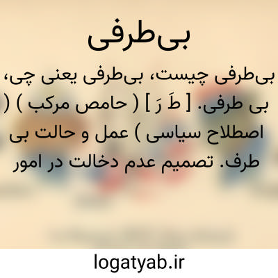 بی طرفی. [ طَ رَ ] ( حامص مرکب ) ( اصطلاح سیاسی ) عمل و حالت بی طرف. تصمیم عدم دخالت در امور سیاسی یا عدم دخول در جنگ که دولت سومی بخود گیرد چون دو دولت در حالت جنگ یا تیرگی مناسبات سیاسی باشند. ( از یادداشت مؤلف ). عدم دخالت در دسته بندیهای سیاسی. || عدم تعصب و جانبداری.