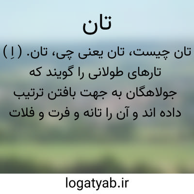 تان. ( اِ ) تارهای طولانی را گویند که جولاهگان به جهت بافتن ترتیب داده اند و آن را تانه و فرت و فلات نیز خوانند. ( فرهنگ جهانگیری ). تار که ریسمان های طول پارچه است. ( فرهنگ نظام )... تار را نیز گویند که نقیض پود باشد ورشته نکنده را هم گویند که جولاهگان از پهنای کار زیاده آورند و آن را نبافند. ( برهان ) ( آنندراج ). رشته نکنده. ( منتهی الارب ) ( ناظم الاطباء ). محمد معین در حاشیه برهان آرد: «از ریشه اوستائی تن ( تنیدن ). رجوع به تانه و تونه و رجوع به شرفنامه منیری شود«: ده مر» عبارت از آن است که تانی آن پانصد تان باشد. ( از لغت محلی شوشتر، نسخه خطی کتابخانه مؤلف ذیل کلمه «ده مر» ).