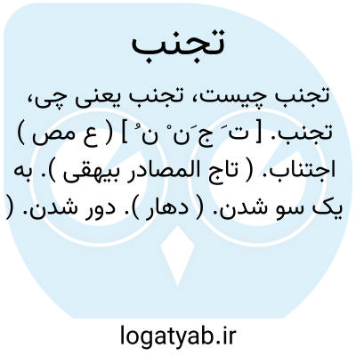 تجنب. [ ت َ ج َن ْ ن ُ ] ( ع مص ) اجتناب. ( تاج المصادر بیهقی ). به یک سو شدن. ( دهار ). دور شدن. ( ترجمان عادل بن علی ). دور شدن از چیزی. ( منتهی الارب ) ( ناظم الاطباء ) ( از اقرب الموارد ) ( از قطر المحیط ). دور شدن و یک سو شدن. ( غیاث اللغات ) ( آنندراج ). اجتناب و دوری کردن. ( فرهنگ نظام ): و در عموم احوال از غفلت و کاهلی تجنب واجب شناسد. ( کلیله و دمنه ). خردمندان... از جنگ عزلت گرفته اند و از بیدار کردن فتنه... تجنب واجب دیده اند. ( کلیله و دمنه ). از دریا و آتش تحرز و تجنب ممکن است و از خشم پادشاه ناممکن و متعذر. ( سندبادنامه ص 72 ). || جنب شدن. ( تاج المصادر بیهقی ). جنب گردیدن. ( منتهی الارب ) ( آنندراج ) ( ناظم الاطباء ).