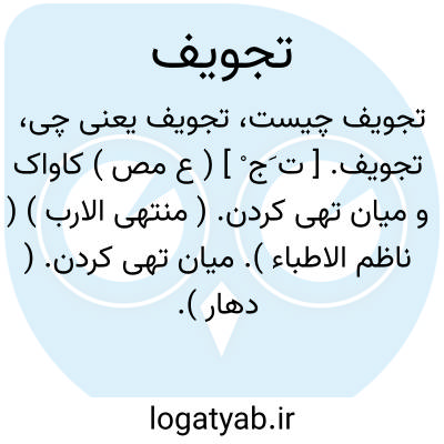 تجویف. [ ت َج ْ ] ( ع مص ) کاواک و میان تهی کردن. ( منتهی الارب ) ( ناظم الاطباء ). میان تهی کردن. ( دهار ). خالی کردن.( غیاث اللغات ) ( آنندراج ) ( فرهنگ نظام ). جوف قرار دادن چیزی را. || خارج کردن آنچه که در جوف آن بود. ( از اقرب الموارد ) ( از قطر المحیط ). || ( اِ ) در محاوره، آنچه که در میان چیزی خالی باشد. ( غیاث اللغات ) ( آنندراج ). جوف و کاواک و مغاره. ( ناظم الاطباء ). نزد اطبا فضایی که در باطن عضو باشد.( فرهنگ نظام ) ( از کشاف اصطلاحات الفنون ): و اگر اندر تجویفها و منفذهاء دماغ باشد [ ماده نزله ] بسیار باشد که سکته آرد. ( ذخیره خوارزمشاهی ).