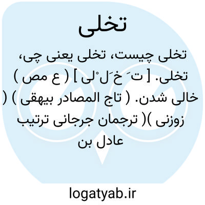 ۱- ( مصدر ) خالی شدن فارغ شدن تهی شدن. ۲- آب تاختن قضای حاجت کردن. ۳- تنها نشستن. ۴- اعراض کردن از شغلهایی که بنده را از خداوند دور دارد مانند حب دنیا متابعت هوا صحبت خلق و غیره. ۵- ( اسم ) قضای حاجت. ۶- تنهایی. جمع: تخلیات.