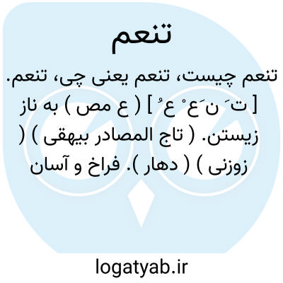 ۱- ( مصدر ) بناز و نعمت زیستنمال و نعمت داشتن. ۲ - بنعمت رسیدن. ۳ - ( اسم ) شاد خواری تن آسانی خوشگذارانی. جمع: تنعمات.