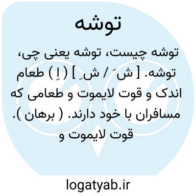 توشه. [ ش َ / ش ِ ] ( اِ ) طعام اندک و قوت لایموت و طعامی که مسافران با خود دارند. ( برهان ). قوت لایموت و طعام مسافران. ( انجمن آرا ). زاد راه که مسافران بردارند و این مجازی است مشهورزیرا که مرکب است از «توش » به معنی قوت و توانائی که «های » نسبت به وی ملحق گشته... ( آنندراج ). زاد راه مرکب از توش به معنی قوت و توانائی و «های » نسبت. با لفظ کشیدن و کردن و برداشتن و گرفتن و بستن مستعمل. ( غیاث اللغات ). و از این است که مسافران طعامی را که همراه دارند توشه نامند. ( فرهنگ جهانگیری ذیل کلمه توش ). به معنی قوت و لازمه سفر. ( انجمن آرا ) ( آنندراج ). طعام اندک و قوت لایموت و تدارک و زاد. و مایحتاج سفر از خوراک. ( ناظم الاطباء ). زاد. ( دهار ). و بالفظ برداشتن و گرفتن و بر کمر بستن و بر دوش بستن کنایه از تهیه سفر کردن است. ( آنندراج ):