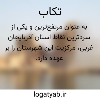تَکاب مرتفع ترین و سردترین شهر استان آذربایجان غربی است. این شهر مرکز شهرستان تکاب بوده و یکی از شهرهای باستانی و قدیمی ایران و جهان است که قدمت آن به دوران هخامنشیان و ساسانیان باز می گردد. تخت سلیمان از مهم ترین مناطق باستانی و فرهنگی ایران است که در میراث جهانی یونسکو ثبت شده است و در ۳۲ کیلومتری تکاب قرار دارد. تکاب به ( شهر تاریخ و تمدن )، ( پایتخت طلا و جواهرات خاورمیانه )، ( شهر معادن )، ( پایتخت سیب ایران )، ( بهشت زمین شناسی جهان )، ( سردترین شهر ایران ) و ( مرکز گیاهان دارویی ایران ) معروف است. [ نیازمند منبع] تکاب در بین چهار استان مهم کشور از جمله کردستان، زنجان، آذربایجان غربی و آذربایجان شرقی قرار گرفته است و تنها شهر استان آذربایجان غربی است که با استان زنجان مرز مشترک دارد و همچنین تکاب تنها شهر آذربایجان غربی است که با هر سه استان همسایه آذربایجان غربی مرز مشترک دارد.