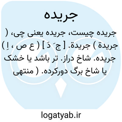 ۱- ( اسم ) دفتر جرید. اعمال. ۲- روزنامه. ۳- شاخ. نخل. ۴- شاخ. بی برگ. ۵- جماعتی از سواران بدون پیاده. جمع: جرائد ( جراید ). ۶- ( صفت ) تنها مجرد: ( ( جریده رو که گذرگاه عافیت تنگست. ) )