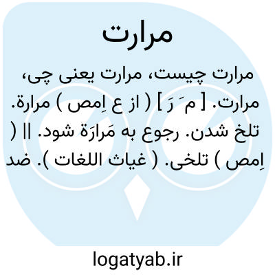 مرارت. [ م َ رَ ] ( از ع اِمص ) مرارة. تلخ شدن. رجوع به مَرارَة شود. || ( اِمص ) تلخی. ( غیاث اللغات ). ضد حلاوت: بداند که مرارت آن کاس و حرارت آن باس کفار را عام است. ( ترجمه تاریخ یمینی ص 354 ). || مشقت. زحمت. رنج. سختی: