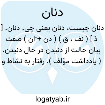 دنان. [ دَ ] ( نف، ق ) ( دن + َان ) صفت بیان حالت از دنیدن در حال دنیدن. ( یادداشت مؤلف ). رفتار به نشاط و خرامان. ( ناظم الاطباء ) ( برهان ). مرادف چمان. ( انجمن آرا ). || راه رونده به نشاط و خرامان.( ناظم الاطباء ) ( برهان ). آنکه همی رود به نشاط، گویند: همی دند و دنان است. ( لغت فرس اسدی ):