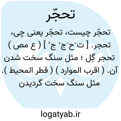 تحجر. [ ت َح َج ْ ج ُ ] ( ع مص ) تحجر گِل؛ مثل سنگ سخت شدن آن. ( اقرب الموارد ) ( قطر المحیط ). مثل سنگ سخت گردیدن چیزی. ( غیاث اللغات ) ( آنندراج ). سخت شدن چیزی مثل سنگ. ( فرهنگ نظام ). || در علم طب، جمع شدن ماده ٔسخت در پلک چشم. ( فرهنگ نظام ). ورم صغیرٌ یدمی و یتحجر فی الجفن. ( مقاله ثالثه از کتاب ثالث قانون بوعلی ص 69 ). ورمی است کوچک که منجمد و متحجر میشود در چشم، چنانکه در بحر الجواهر گفته است. ( کشاف اصطلاحات الفنون ). || تحجر مفاصل؛ خشک شدن و تصلب مفاصل: چون تحجر مفاصل که عضوی را از حرکت طبیعی بازدارد. ( ذخیره خوارزمشاهی ). || تحجر جُرح؛ ریمناک و سخت گردیدن جراحت. ( منتهی الارب ) ( ناظم الاطباء ) ( آنندراج ). تحجر جُرح للبرء؛ جمع شدن و التیام یافتن و بهم نزدیک شدن قسمتهای زخم. ( از اقرب الموارد ): لما تحجر جرحه للبرء انفجر؛ ای اجتمع و التأم و قرب بعضه من بعض. ( تاج العروس ). || تنگ کردن. ( تاج المصادر بیهقی ). تحجر بر کسی؛ تنگ گرفتن بر او. ( منتهی الارب ) ( آنندراج ) ( ناظم الاطباء ) ( از اقرب الموارد ) ( از قطر المحیط ). و گویند: تحجر ما وسعه ُ اﷲ تعالی؛ اذا ضیقه ُ علی نفسه ِ و حرمه ُ. ( قطر المحیط ). || حجره ساختن. ( منتهی الارب ) ( آنندراج ) ( ناظم الاطباء ) ( از اقرب الموارد ) ( از قطر المحیط ).