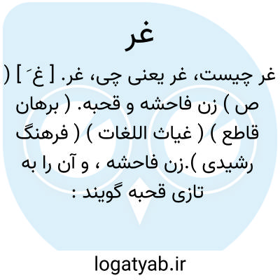 غر. [ غ َ ] ( ص ) زن فاحشه و قحبه. ( برهان قاطع ) ( غیاث اللغات ) ( فرهنگ رشیدی ).زن فاحشه، و آن را به تازی قحبه گویند: