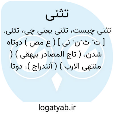 تثنی. [ ت َ ث َن ْ نی ] ( ع مص ) دوتاه شدن. ( تاج المصادر بیهقی ) ( منتهی الارب ) ( آنندراج ). دوتا شدن. ( زوزنی ) ( ناظم الاطباء ). بدو درآمدن. ( تاج المصادر بیهقی ) ( زوزنی ). || گردیده شدن. ( شرح قاموس ). بازگردیدن. ( منتهی الارب ) ( ناظم الاطباء ) ( آنندراج ). انصراف. ( قطر المحیط ). || خرامیدن. ( منتهی الارب ) ( ناظم الاطباء ) ( آنندراج ): تثنی فلان فی مشیته؛ تمایل.