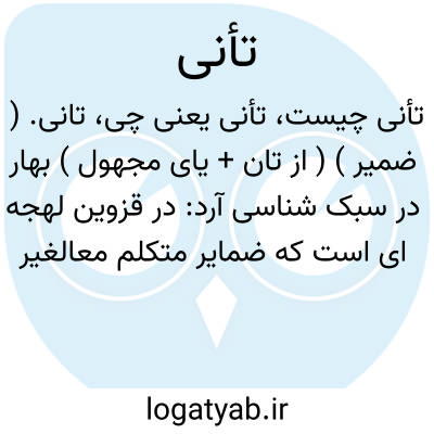 تانی. ( ضمیر ) ( از تان + یای مجهول ) بهار در سبک شناسی آرد: در قزوین لهجه ای است که ضمایر متکلم معالغیر و جمع مخاطب و جمع مغایب را بشکل مان، تان، شان می آورند ولی در ادبیات ظاهراً بسیار نادر و شاذ است و بیشتر در نثر فارسی این ضمیر را در متکلم معالغیر و دوم شخص جمع بایاء مجهول ترکیب میکرده اند چون: کردمانی و کردتانی.و این مخصوص بلعمی است و کشف المحجوب و اسرارالتوحیدو تذکرةالاولیاء نیز آورده اند ولی در مقدمه شاهنامه و تاریخ سیستان و گردیزی و بیهقی نیست و در شعر نیزبنظر حقیر نرسیده است، اما بعید نیست که با همه ثقیلی که دارد باز هم در شعری آمده باشد، و نیز بعید نیست که در جمع مغایب ماضی نیز این صیغه ساخته شده باشد و کردشانی نیز آمده باشد ولی بنظر حقیر نرسیده است. ( سبک شناسی ج 1 ص 348 ). و در حاشیه همین صفحه افزاید: رک. مقدمه ج 2 تدکرةالاولیاء چ لیدن ص ( کا ). آقای قزوینی در این مقدمه در حاشیه گویند که جناب پروفسور ادوارد براون نوشته بود که بجای کردیمی و کردیدی و کردندی، کردمانی، کردتانی و کردشانی استعمال می کنند [یعنی تذکرةالاولیاء]، بنده کردتانی و کردشانی پیدا نکردم و احتمال میدهم در جلد دوم پیدا شود - انتهی. و این حقیر مؤلف کتاب [کتاب سبک شناسی ] جلد دوم را نیز مطالعه کردم و «کردشانی » نیافتم -انتهی. و رجوع بمقدمه ٔچهارمقاله چ معین ص شصت ونه حاشیه و متن آن ص 126 شود: بایستی چون شما را ناپارسایی او معلوم شد غوغا نکردتانی. ( اسکندرنامه نسخه سعید نفیسی ).