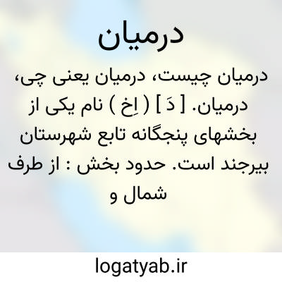 درمیان.[ دَ ] ( اِخ ) قصبه مرکزی بخش درمیان شهرستان بیرجند است. طول جغرافیائی آن 52 درجه و 57 دقیقه و عرض جغرافیائی 32 درجه و 43 دقیقه است. این قصبه در 100 هزارگزی جنوب شهر بیرجند واقع و هوای آن معتدل و آب آن از قنات است. در حدود 15 باب دکاکین مختلف دارد و ادارات دولتی، بخشداری، ژاندارمری، نمایندگی آمار، ثبت ازدواج و طلاق، دارائی، پست و تلگراف و دبستان در این ده واقع است. ( از فرهنگ جغرافیایی ایران ج 9 ).