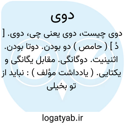 دوی. [ دُ ] ( حامص ) دو بودن. دوتا بودن. اثنینیت. دوگانگی. مقابل یگانگی و یکتایی. ( یادداشت مؤلف ):