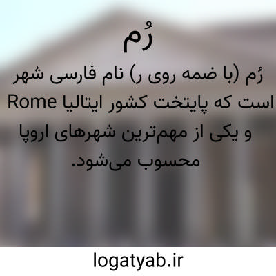 رُم (با ضمه روی ر) نام فارسی شهر Rome است که پایتخت کشور ایتالیا و یکی از مهم‌ترین شهرهای اروپا محسوب می‌شود. این شهر از قدیمی‌ترین مراکز تمدنی جهان است و تاریخ آن به دوران امپراتوری روم در چند هزار سال پیش برمی‌گردد. رُم زمانی مرکز امپراتوری عظیم روم بود که بخش بزرگی از اروپا، شمال آفریقا و غرب آسیا را تحت سلطه داشت. امروزه این شهر علاوه بر اهمیت سیاسی، یک مرکز بزرگ فرهنگی، تاریخی و گردشگری در سطح جهانی به شمار می‌رود. آثار تاریخی معروفی مانند کولوسئوم، فروم رومی و بناهای باستانی متعدد در این شهر قرار دارند. رُم همچنین محل قرارگیری واتیکان است که مقر کلیسای کاتولیک و کوچک‌ترین کشور مستقل جهان محسوب می‌شود. این شهر جمعیتی چند میلیونی دارد و یکی از پرجمعیت‌ترین و پررفت‌وآمدترین شهرهای اروپا است. در رُم هنر، معماری و تاریخ با زندگی مدرن امروزی در کنار هم دیده می‌شود و جلوه‌ای خاص ایجاد کرده است. این شهر تأثیر زیادی بر فرهنگ، حقوق، سیاست و تمدن غرب در طول تاریخ گذاشته است. در نتیجه، این کلمه به شهری تاریخی و مهم در ایتالیا گفته می‌شود که جایگاه ویژه‌ای در تاریخ جهان دارد.