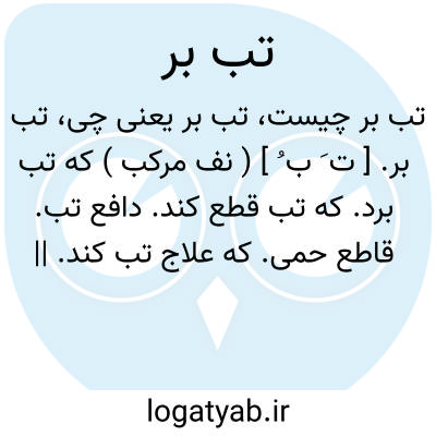 تب بر. [ ت َ ب ُ ] ( نف مرکب ) که تب برد. که تب قطع کند. دافع تب. قاطع حمی. که علاج تب کند. || دارویی تب بر. هر دوا که قطع تب کند. دواهای تب بر: کتین، پوست بید، اکالیپتوس. خینورمین بهترین تب برها است. آتبرین در مالاریا تب بر است.