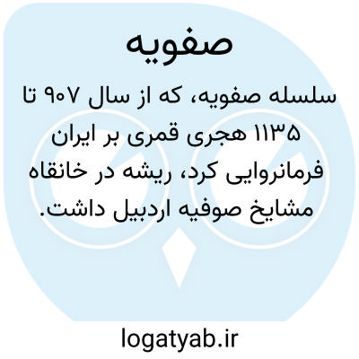(تاریخ): دودمان سلسله صفویان منسوب به شیخ صفی‌الدین اردبیلی که در ایران از سال ۸۸۰ خورشیدی تا ۱۱۱۴ خورشیدی پادشاهی کردند. صفویه به سه بخش صف - وَ - ئیه قابل تجزیه است و احتمالا از تصحیف شده اصطلاح زبان آذری صفه‌بی‌ئیه یعنی احساس یا حس به هر صف یکی، است.