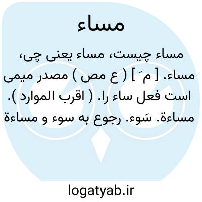 مساء. [ م َ ] ( ع مص ) مصدر میمی است فعل ساء را. ( اقرب الموارد ). مساءة. سَوء. رجوع به سوء و مساءة شود.