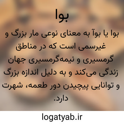 ( بو آ ) ( اسم ) مار عظیم الجثه ای از دسته ماران بی زهر که ۵ گونه از آن شناخته شده و در آمریکای شمالی و جنوبی و جزایر آنتیل و هندوستان و هندوچین و مجمع الجزایر مالزی و جزیر. سر اندیب ( سیلان ) میزیند. بعضی از گونه های این جانور ممکن است بیش از ۶ متر طول پیدا کنند. این جانور از پستانداران کوچک دیگر ( از قبیل خرگوش و غیره ) تغذیه میکند ولی هیچوقت بانسان حمله نمیکند اژدرمار.