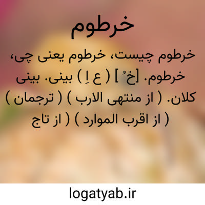 شله ای سازیم بر خرطوم او.مولوی ( مثنوی ). || پیش بینی. ( از منتهی الارب ) ( از اقرب الموارد )( از تاج العروس ) ( از لسان العرب ). ج، خراطم. || فراهم آمدنگاه دو حنک. ( منتهی الارب ) ( از تاج العروس ) ( از لسان العرب ). ج، خراطیم. || می زودنشئه. ( منتهی الارب ) ( از تاج العروس ) ( از لسان العرب ). ج، خراطیم. || نخست آبی که از انگور برآید قبل از مالیدن. ( منتهی الارب ) ( از آنندراج ) ( ازتاج العروس ) ( از لسان العرب ) ( از ناظم الاطباء ). ج، خراطیم. || بینی فیل. ( منتهی الارب ) ( از تاج العروس ) ( از لسان العرب ):
