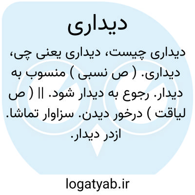 عکسش اینک ز رخم دیداری.کمال اسماعیل. || توری. تور. کلوته. شبکه. جامه مشبک. جامه که اشیاء واقعدر پشت آن را بعلت سوراخهای خرد که در آن است توان دید. ( یادداشت مؤلف ): آنچه زر نقد بود درکیس های حریر سرخ و سبز و سیمها در کیس های زرد دیداری. ( تاریخ بیهقی ). و سقلاطون و ملحم و دیبای رومی و ترکی و دیداری. ( تاریخ بیهقی ). || در اصطلاح بانک. چیزی که در هنگام دیدن باید انجام گیرد.