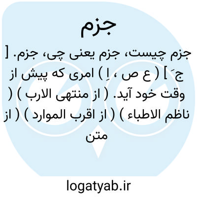 جزم. [ ج َ ] ( ع ص، اِ ) امری که پیش از وقت خود آید. ( از منتهی الارب ) ( ناظم الاطباء ) ( از اقرب الموارد ) ( از متن اللغة ). از کارها پیش از هنگام آمدن.( شرح قاموس ). || سرراست. ( مقدمه لغت میرسیدشریف ص 5 ). || قلم راست بریده، ضد محرف.( منتهی الارب ) ( ناظم الاطباء ) ( از اقرب الموارد ) ( از متن اللغة ). || خط عربی، بدانجهت که از خطحِمْیَر بریده گردیده. ( منتهی الارب ) ( ناظم الاطباء ).خط عربی پیش از آنکه [ به خط ] کوفی شهرت یابد. ( ازمتن اللغة ). این خطی که از حروف معجم تشکیل شده بدانجهت که از خط حِمْیَر که به خط مسند معروف بود جدا شده است. ( از اقرب الموارد ). || چیزی از خرقه و مانند آن که بدان فرج ناقه را پر سازند تا بر غیر بچه خود مهربان و مایل باشد. ( منتهی الارب ) ( ناظم الاطباء ). چیزی که فرج ناقه را با آن پر سازند تا آنرا بچه خود پندارد و بر آن مهربان باشد که آنرا دُرجه گویند. ( از متن اللغة ) ( از ذیل اقرب الموارد ).