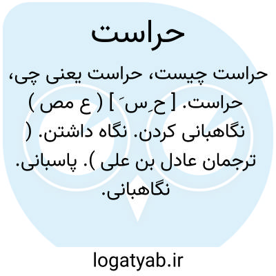 حراست. [ ح ِس َ ] ( ع مص ) نگاهبانی کردن. نگاه داشتن. ( ترجمان عادل بن علی ). پاسبانی. نگاهبانی. نگهبانی. حفظ. نگاهداری. مراقبت. رقابت. پاسبانی کردن. ( دهار ) ( ترجمان عادل بن علی ). نگاهبانی کردن چیزی یا کسی را. نگه داشتن. ( تاج المصادر بیهقی ). صیانت کردن. محافظت کردن. پاس داشتن. حمایت. مراعات کردن. ضبط کردن: