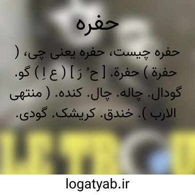 ( حفرة ) حفرة. [ ح ُ رَ ] ( ع اِ ) گو. گودال. چاله. چال. کنده. ( منتهی الارب ). خندق. کریشک. گودی. مغاک. سوراخ. ( غیاث ). حفیرة. کاویده: