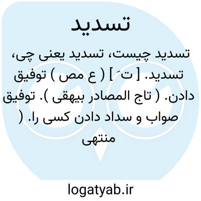 تسدید. [ ت َ ] ( ع مص ) توفیق دادن. ( تاج المصادر بیهقی ). توفیق صواب و سداد دادن کسی را. ( منتهی الارب ) ( ناظم الاطباء ). نیکو کردن و توفیق صواب و سداد دادن خدا کسی را در قول و عمل. ( از متن اللغة ). توفیق دادن و ارشاد کردن کسی را بر سداد یا در صواب در کردار و گفتار. ( از اقرب الموارد ). ارشاد کردن کسی را به صواب. ( از المنجد ): و از ایزد تعالی امداد توفیق و تسدید خواهیم. ( سندبادنامه ص 30 ). || راست گردانیدن. ( تاج المصادر بیهقی ). راست کردن. ( دهار ). راست و درست کردن. ( منتهی الارب ) ( ناظم الاطباء ). راست و درست نمودن و درستی و استواری. ( غیاث اللغات ) ( آنندراج ). || راست کردن نیزه و در طول نهادن آنرا، خلاف تعریض. ( منتهی الارب ) ( ناظم الاطباء ). تسدید رمح؛ تقویم آن. ( از متن اللغة ) ( از المنجد ): سَدَّدَ الرمح و نحوه ُ؛ قَوَّمَه ُ و هو خلاف عرضه ُ. ( اقرب الموارد ). || راست کردن تیر را بسوی شکار. ( منتهی الارب ) ( ناظم الاطباء ) ( از متن اللغة ). || توفیق صواب یافتن و صواب جستن. ( منتهی الارب ) ( ناظم الاطباء ). طلب سداد کردن کسی در اعمال خود. ( از متن اللغة ). || میانه راه رفتن در قول و فعل. ( منتهی الارب ) ( ناظم الاطباء ). || آموختن نضال کسی را. || راندن شتر را به هر جای سبز و خرم و صاف و هموار. || اصلاح کردن رخنه و تَرَک چیزی. || نیک عمل کردن در مال خود. ( از متن اللغة ).