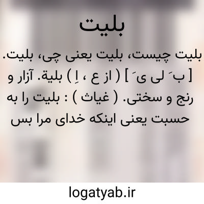 بلیت. [ ب َ لی ی َ ] ( از ع، اِ ) بلیة. آزار و رنج و سختی. ( غیاث ): بلیت را به حسبت یعنی اینکه خدای مرا بس است آنچنان حسبتی که آثار بلیه را نابود گرداند. ( تاریخ بیهقی ص 309 ). معترف است در صورت نعمت به احسان او و راضی است در صورت بلیت به آزمودن او. ( تاریخ بیهقی ص 309 ). نایره آتش بلیت خامد نشود. ( جهانگشای جوینی ). مردم آن قریه به علت جاهی که داشت بلیتش می کشیدند و اذیتش را مصلحت نمی دیدند. ( گلستان ). و رجوع به بلیة شود.