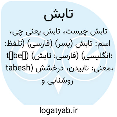 معنی: تابیدن، درخشش، روشنایی و گرمی آفتاب یا آتش، فروغ، پرتو، ( اسم مصدر از تابیدن )، عمل تابیدن، شعاع هایی که از منبع تابنده پراکنده می شود، نور، روشنی