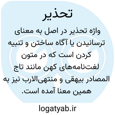 تحذیر. [ ت َ ] ( ع مص ) ترسانیدن. ( تاج المصادر بیهقی ) ( ترجمان جرجانی ترتیب عادل بن علی ) ( منتهی الارب ) ( ناظم الاطباء ) ( فرهنگ نظام ) ( اقرب الموارد ) ( قطر المحیط ). || تحریز و تنبیه. ( قطر المحیط ) ( اقرب الموارد ). || ( اصطلاح نحو ) تحذیر آنست که مخاطب را به امری که احتراز از آن واجب است متوجه کنند. احکام تحذیر: تحذیر یا با «ایّاک َ» و فروع آنست و یا بدون آن. هر گاه با «ایاک » باشد محذرمنه پس از آن، بحال عطف یا غیر عطف آید و منصوب باشد و یا آنکه بوسیله «مِن » مجرور گردد و در هر سه حالت، فعل ناصب وجوباً مقدر میشود، مانند: ایاک والشرَّ، ایاک الشرَّ، ایاک من الشر. و تقدیر در نخستین و دوم اینست: احذرک و احذر الشر، و در سوم: احذرک من الشر. و اگر بی ایاک باشد یا محذرمنه مکرر میشود بحال غیر عطف یا آنکه بصورت مفرد میماند و در هر حال محذرمنه منصوب است، مانند: الشرَّ الشرَّ، الشرَّ والشرَّ، الکذب َ. و تقدیر در آنها چنین است: اِحذر الشرَّ یا اِحذر الکذب َ. و در صورت تکرار و عطف، فعل ناصب وجوباً حذف میشود ودر باقی حذف بطور جواز است. هر گاه «ایاک » بر فعل درآید واجب است که پس از آن «مِن » ( حرف جر ) مقدر گرددو فعل با «اَن » مصدری مقرون باشد، مانند: ایاک اَن تفعل هذا؛ یعنی: ایاک مِن فعل هذا. ( از القواعد الجلیة ج 3 ص 193 ). و رجوع به کشاف اصطلاحات الفنون شود.