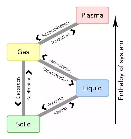 تبدیل مواد مایع یا جامد به گاز یا بخار. اگرچه اغلب مواد ابتدا از جامد به مایع و سپس از مایع به گاز تبدیل می شوند، بعضی از مواد مستقیماً از حالت جامد به حالت گاز تبدیل می شوند. این فرآیند را تصعید می نامند. هنگامی که به مایعی که به نقطۀ جوش رسیده است گرما بدهیم و فشار را ثابت نگه داریم، مولکول های مایع انرژی کافی برای غلبه بر نیروهای بین مولکولی در حالت مایع را پیدا می کنند و به صورت مولکول های مجزای بخار از سطح مایع می گریزند تا تبخیر کامل شود. تبخیر در نقطۀ جوش را جوشش می نامند. هنگام تبدیل مایع به گاز، نقطۀ جوش مایع ثابت می ماند. برای تبخیرِ مقدار معینی از هر مایع باید مقدار خاصی گرما به آن مایع داد. این مقدار گرما را گرمای نهان تبخیر ماده می نامند. مایعات در دمایی پایین تر از نقطۀ جوش نیز تبخیر می شوند. هنگامی که سطح مایع در معرض هوای آزاد باشد، تبخیر در هر دمایی صورت می گیرد، اما هرگاه مایع در فضایی بسته باشد و مقدار آن بیشتر از مقدار لازم برای اشباع آن فضا باشد، به زودی بین مولکول های بخاری که از سطح مایع جدا می شوند و مولکول هایی که به سطح مایع باز می گردند، تعادل برقرار می شود. تغییر دما ممکن است این تعادل را بر هم بزند. مثلاً، افزایش دما سبب افزایش فعالیت مولکول ها در سطح مایع می شود و درنتیجه آهنگ تبخیر افزایش می یابد. هنگامی که دما، در این مقدار جدید، مدتی کوتاه ثابت بماند تعادل به سرعت برقرار خواهد شد.