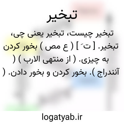 تبخیر. [ ت َ ] ( ع مص ) بخور کردن به چیزی. ( از منتهی الارب ) ( آنندراج ). بخور کردن و بخور دادن. ( ناظم الاطباء ). خویشتن بوی کردن ببخور. ( دهار ): و بخّره و بخر علیه؛ دخنه بالبخور. ( اقرب الموارد ) ( قطر المحیط ). || بخار انگیختن از چیزی. ( فرهنگ نظام ). || بخار شدن. ( ناظم الاطباء ). || تبخیر در اصطلاح فیزیک، تغییر حالت از مایع به حالت بخار را گویند.